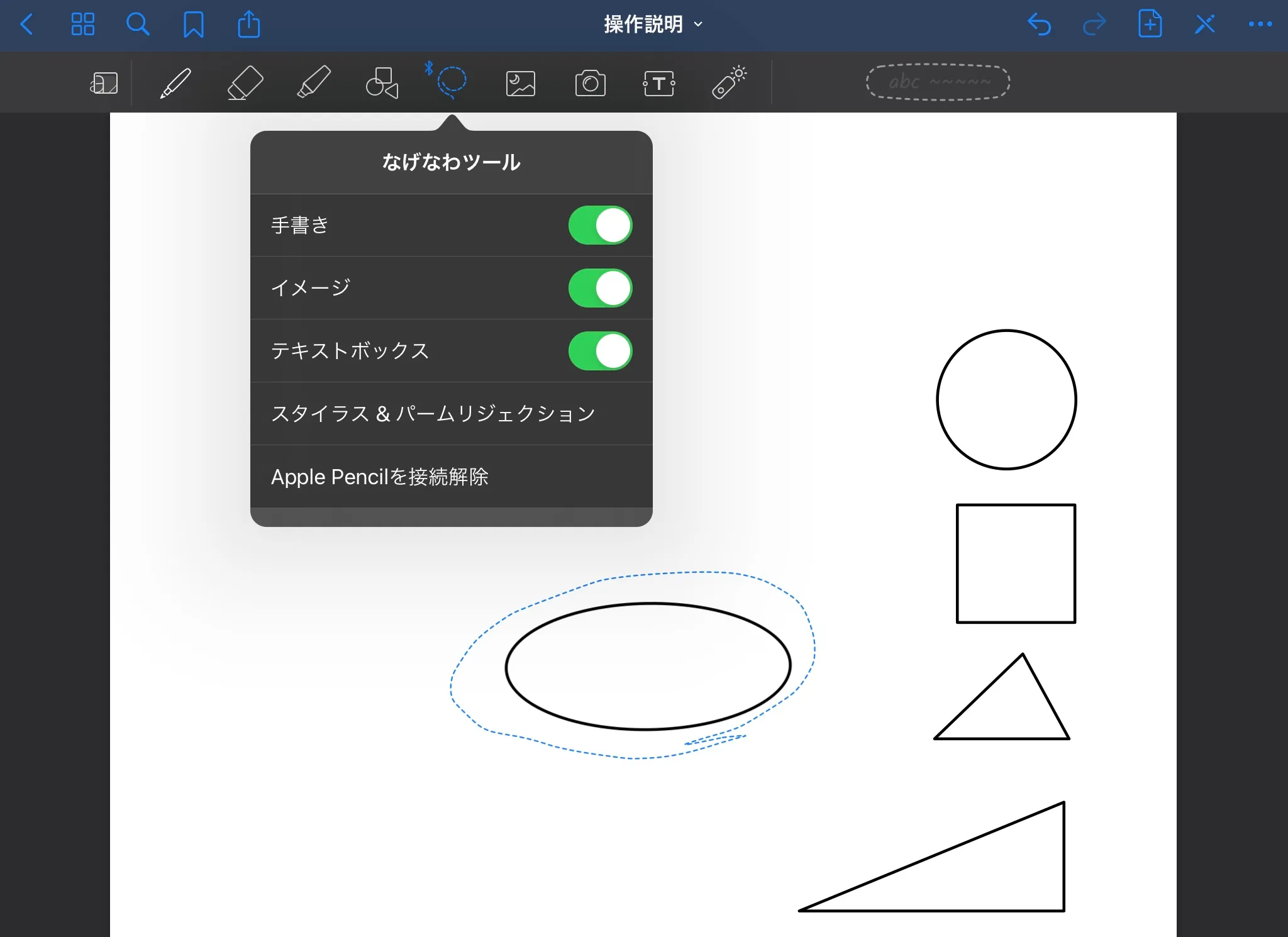 シェイプツールを用いて手描きで楕円(だえん)や円,四角形,三角形等を描画すると,下の画像のように自動で近い形状に修正されます.