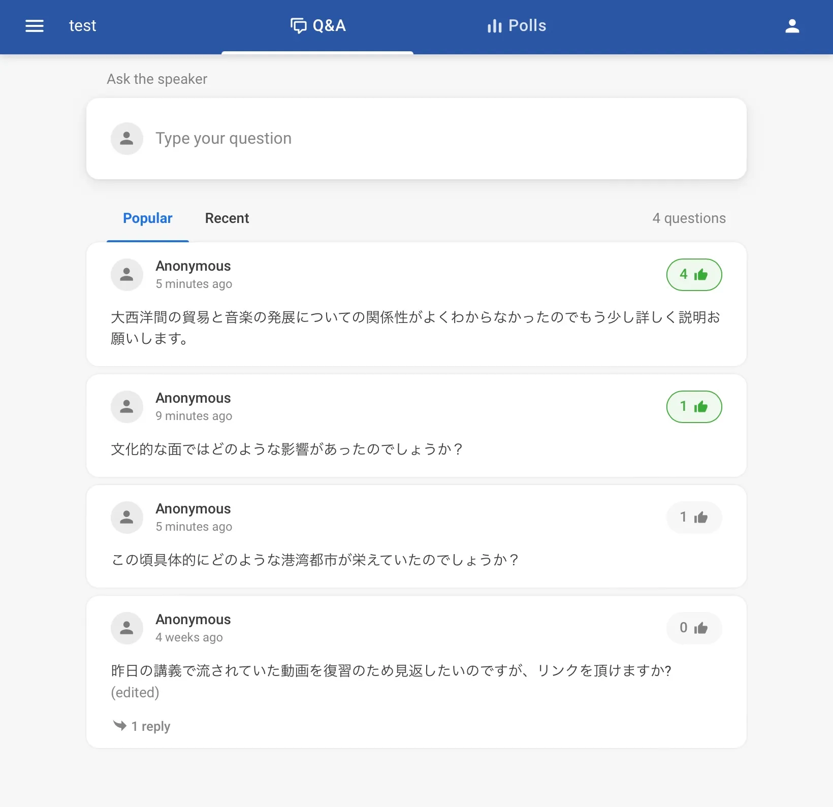 In particular, what makes Slido convenient is the ability to “Like” questions and to respond to comments, which makes it suited for collecting and answering large numbers of questions.