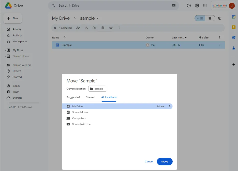 To proceed with the following steps, make sure you are already logged into ECCS Cloud Mail and have Google Drive open in your browser. If you have not completed these two steps, please refer to “Open Google Drive in the browser” on the Google Drive page (an English translation is planned).