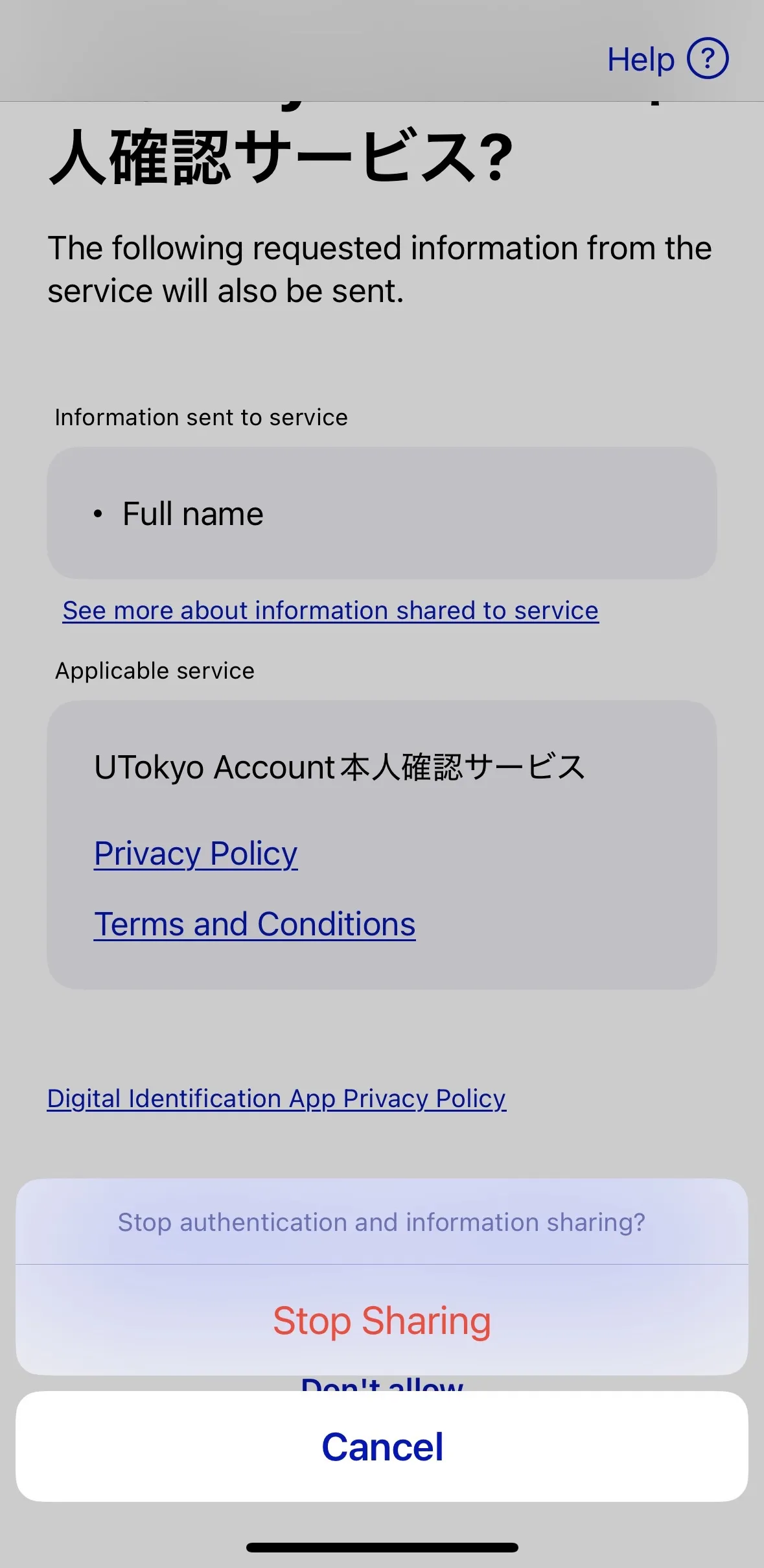 8. A screen will appear asking for permission to authenticate with the UTokyo Account Identity Verification Service. After reviewing the privacy policy and terms and conditions, tap “Allow”.