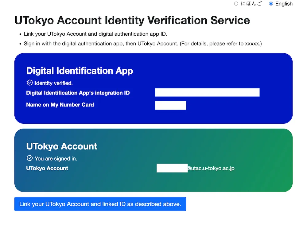 You can check the link status on the UTokyo Account Identity Verification Service or the “View Your UTokyo Account User Information” site.