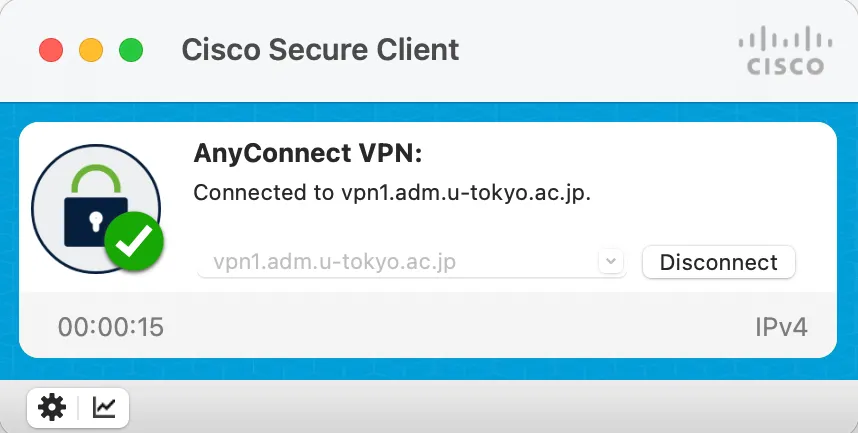Step I: To view the current connection status, click on the “Cisco Secure Client” icon again. If the window displaying “Connected to vpn1.adm.u-tokyo.ac.jp” illustrated below appears, your device is connected to the UTokyo VPN.