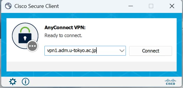 Step E: After launching the “Cisco Secure Client” installed following the Preparation steps, the window illustrated below will appear. Enter vpn1.adm.u-tokyo.ac.jp as the VPN server. Click the “Connect” button.