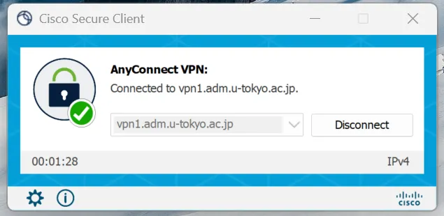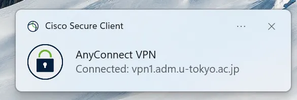 Step H: To view the current connection status, click on the “Cisco Secure Client” icon again. If the window displaying “Connected to vpn1.adm.u-tokyo.ac.jp.” illustrated below appears, your device is connected to UTokyo VPN.
