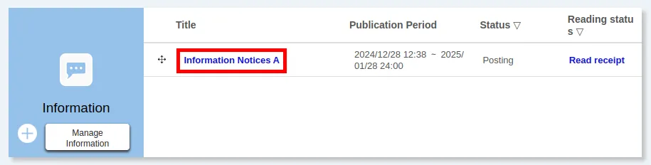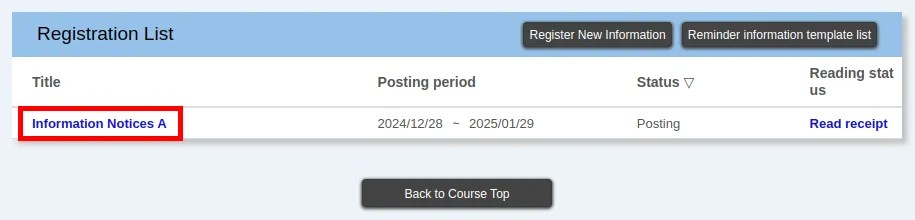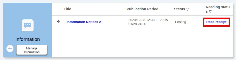 1. Click “Read receipt” in the relevant information notices of the “Information” section on the Course Top or “Manage information” screen.