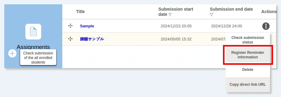 1. For the assignment you wish to register as a reminder notice, click the ⋮ mark in the “Actions” field in the “Assignment” section of the Course Top screen, and then click the “Register Reminder Information” from the menu displayed on the screen.