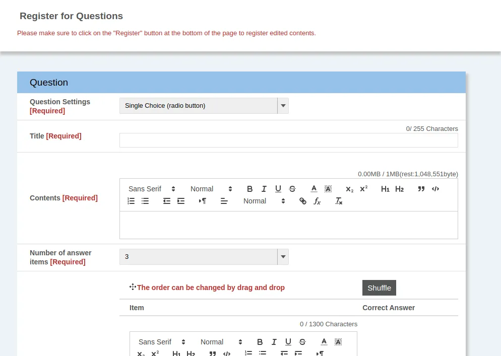 - Number of answer items*: (Except for the Free-text format) The number of answer choices or blanks
