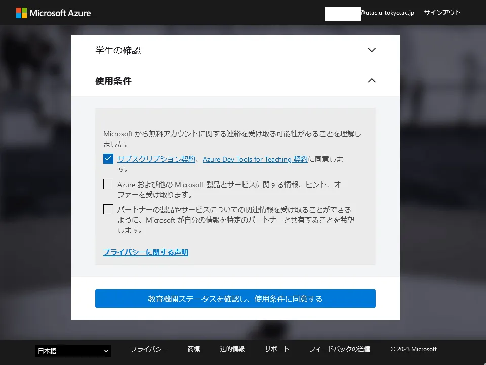 4. サインインが完了したら,順に「学生の確認」「使用条件」といった画面に移動します.表示される指示に従い,手続きを進めてください.
