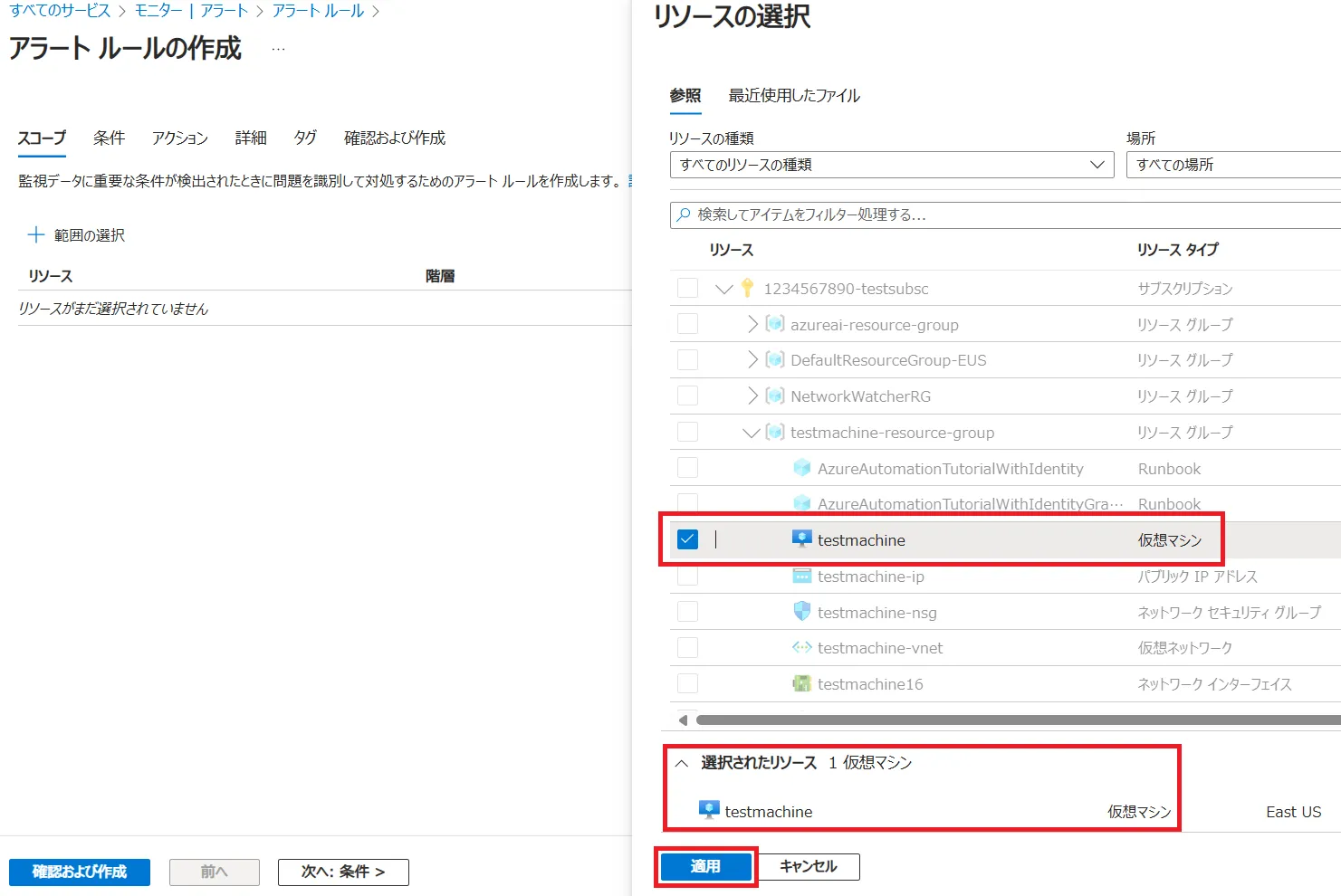 testmachineを選択します. 選択されたリソースに監視対象のリソースが選択されていることを確認の上、適用をクリックしてください.