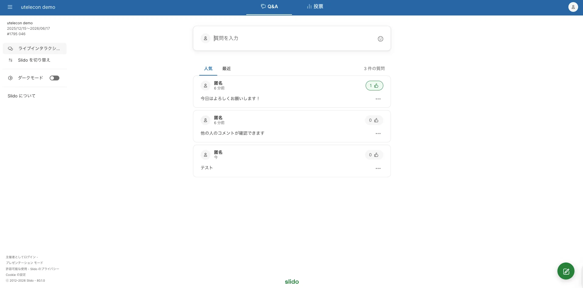 このページでは,Slidoで受講者(学生)ができる操作を説明しています.