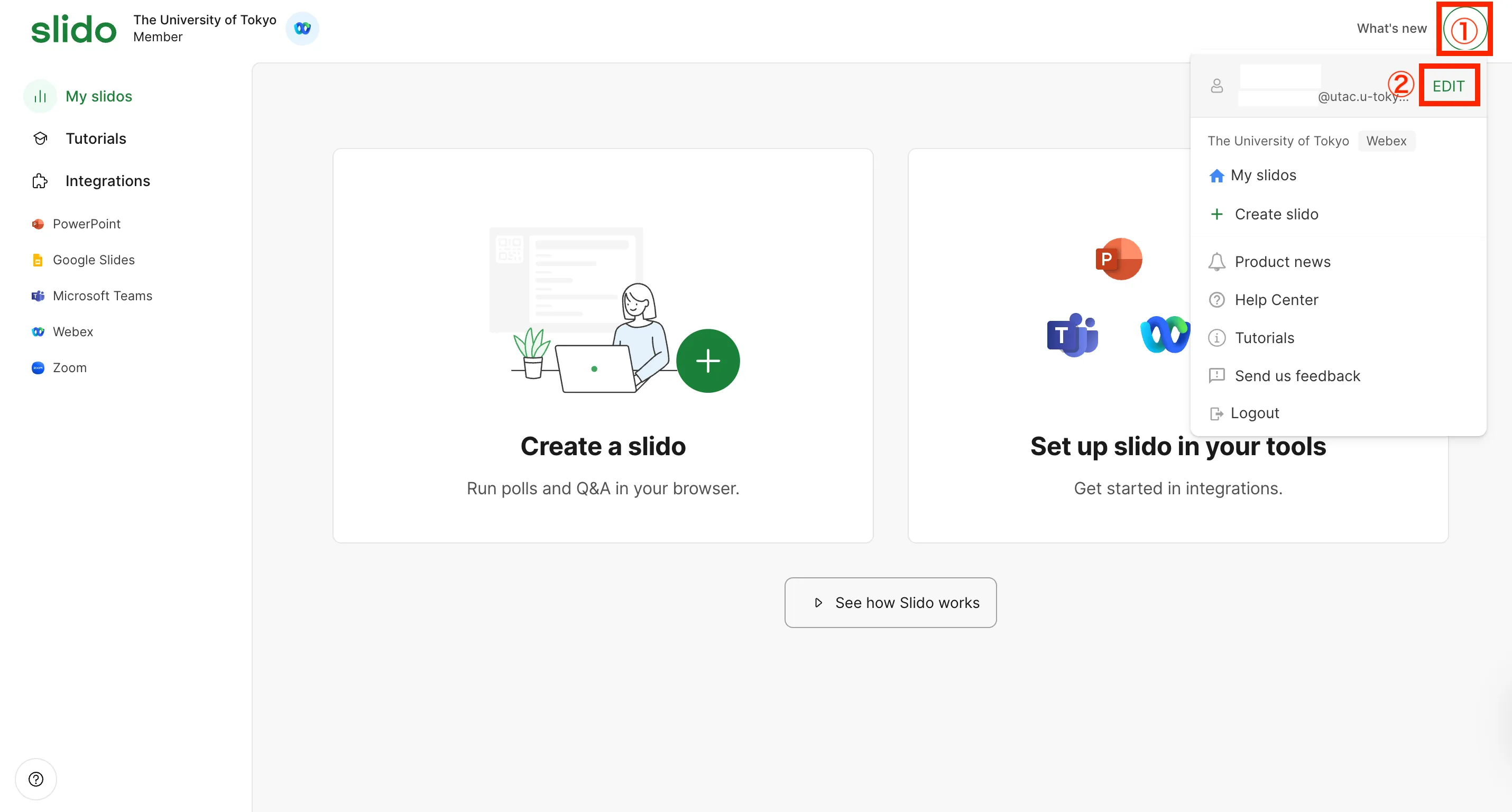 1. ①画面右上のプロフィールアイコンをクリックし,②「EDIT」ボタンをクリックしてください.
