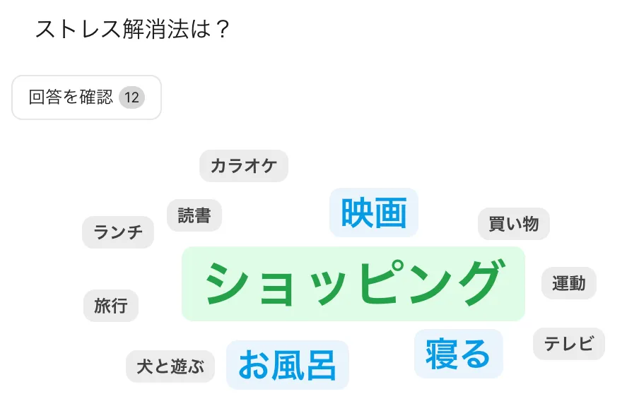 • 回答が図のように表示されます.同一の回答が複数あった場合,その単語が大きく表示されます.(学生側の表示)