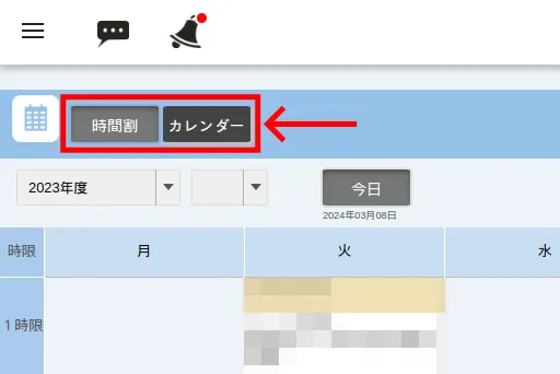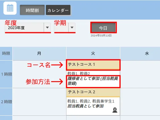 コースは時間割形式またはカレンダーとして表示でき,画面上部のボタンで切り替えられます.