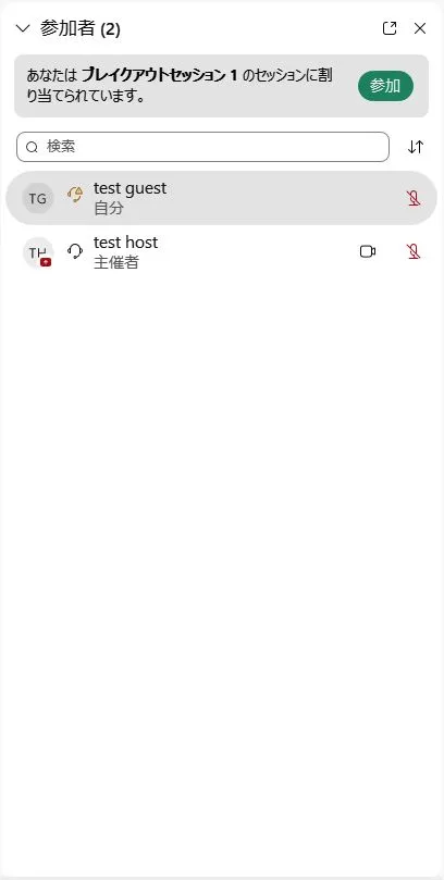 - マイクのアイコン: マイクのアイコンが赤くなっている参加者は,マイクがミュート状態になっています.主催者は,参加者のマイクをミュートすることもできます.上の図では,test hostとtest userのマイクはミュート状態になっています.