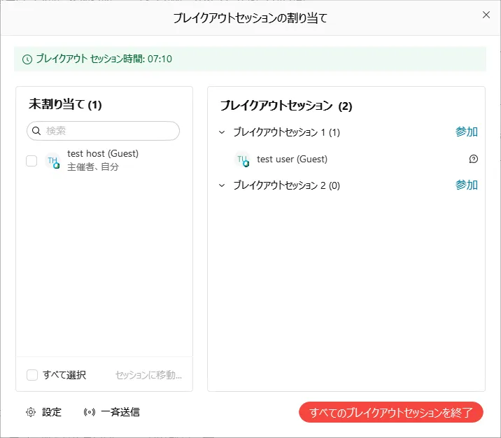 「割り当て」をクリックすると,ブレイクアウトセッションの管理ウィンドウが表示されます.
