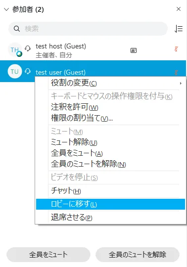 すでに会議に参加している参加者をロビーに追い出すこともできます.該当の参加者を右クリックして「ロビーに移す」を選択します.このときにその参加者がプレゼンターに指名されていると,追い出すことができません.