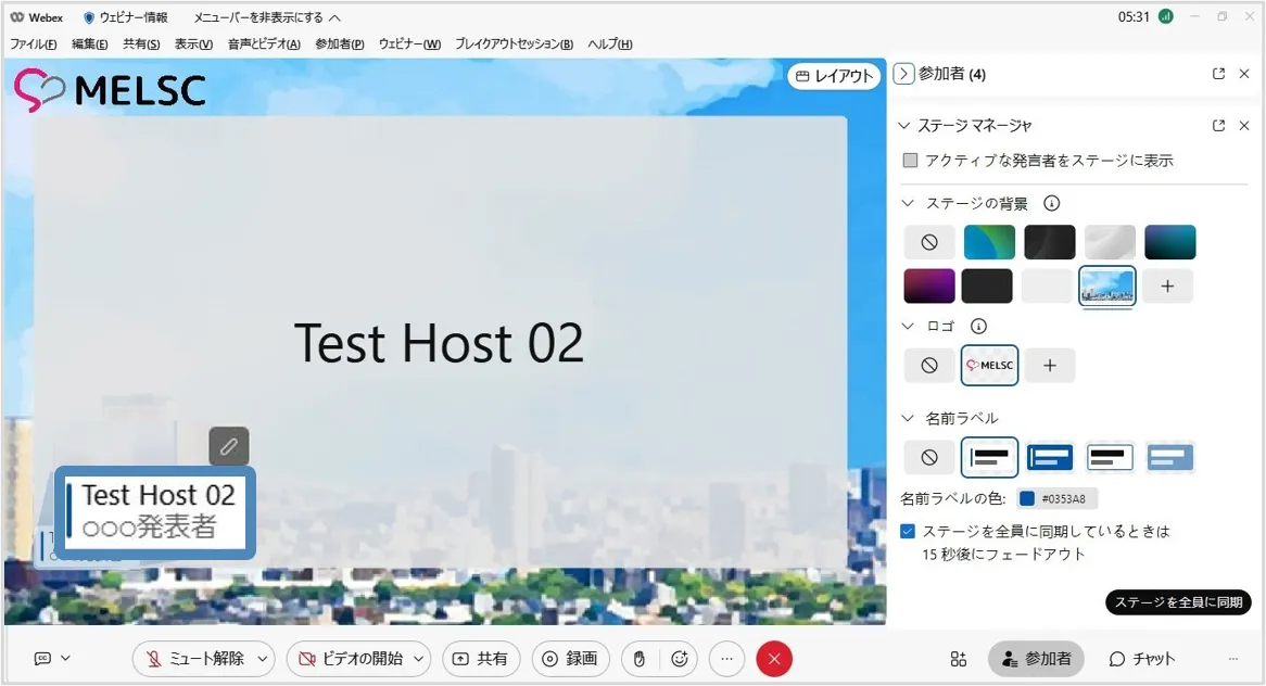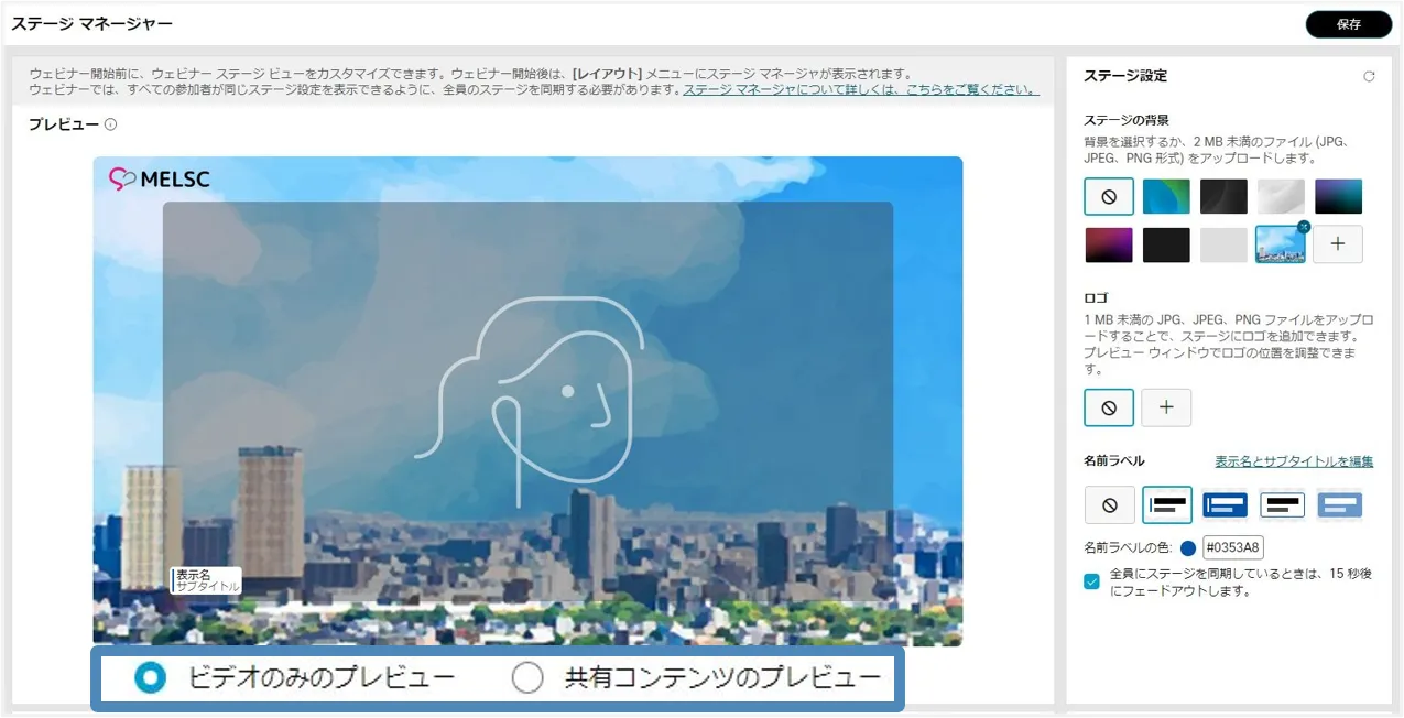 ステージマネージャー機能を使用すると,背景やロゴ・カスタマイズした名前ラベルをステージに設定でき,効果的なウェビナーの開催に貢献します.