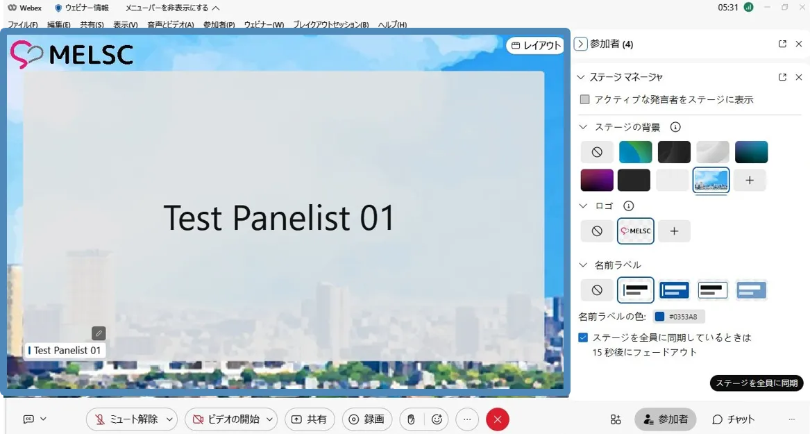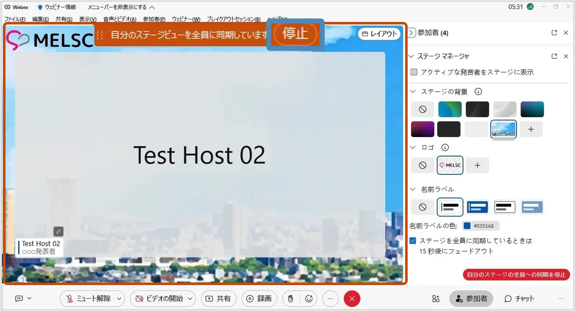 ※停止した場合,出席者はステージマネージャーで設定した背景などは利用することはできません.再度「同期」するとステージマネージャーで設定したレイアウトを使用できます.