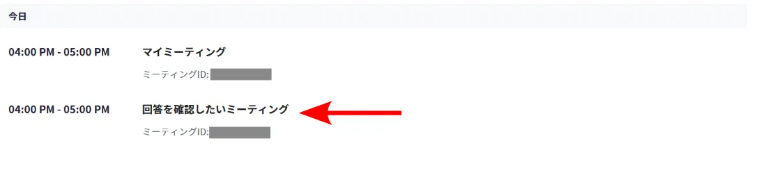 - 自分のスケジュールしたミーティングが,リストとして表示されます.登録者の回答を閲覧したいミーティングの名前を押してください.