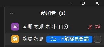 表示された参加者の一覧のうち,共同ホストになっている参加者には,名前の右側に「(共同ホスト)」の表示があります.