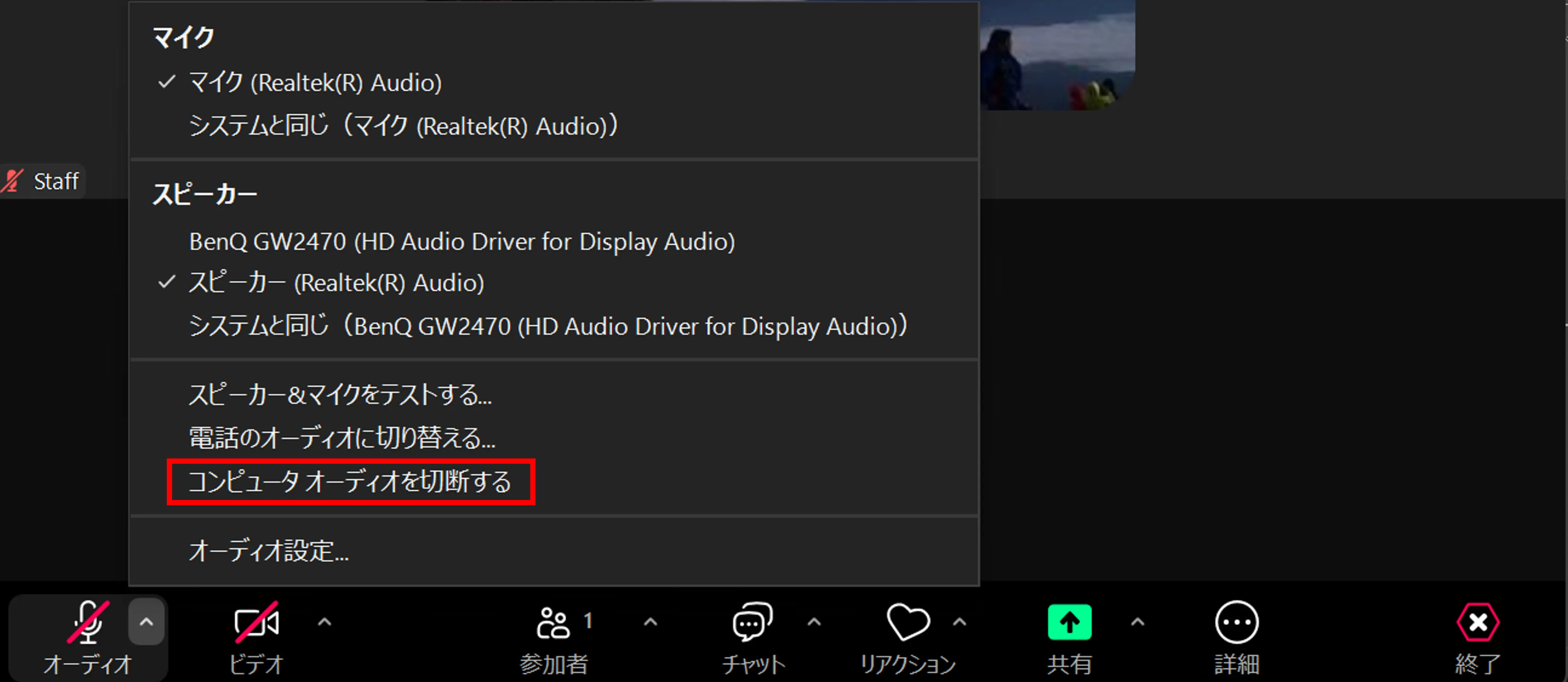 マイクのアイコンの右側にある上向きの矢印を押すと表示されるメニューの中の「コンピュータ オーディオを切断する」を選択してください.