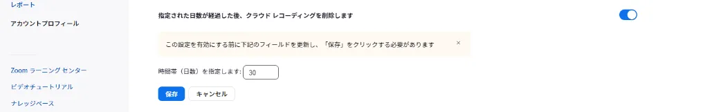 - 「指定された日数が経過した後、クラウド レコーディングを削除します」という項目で,トグルを選択して有効にしてください.